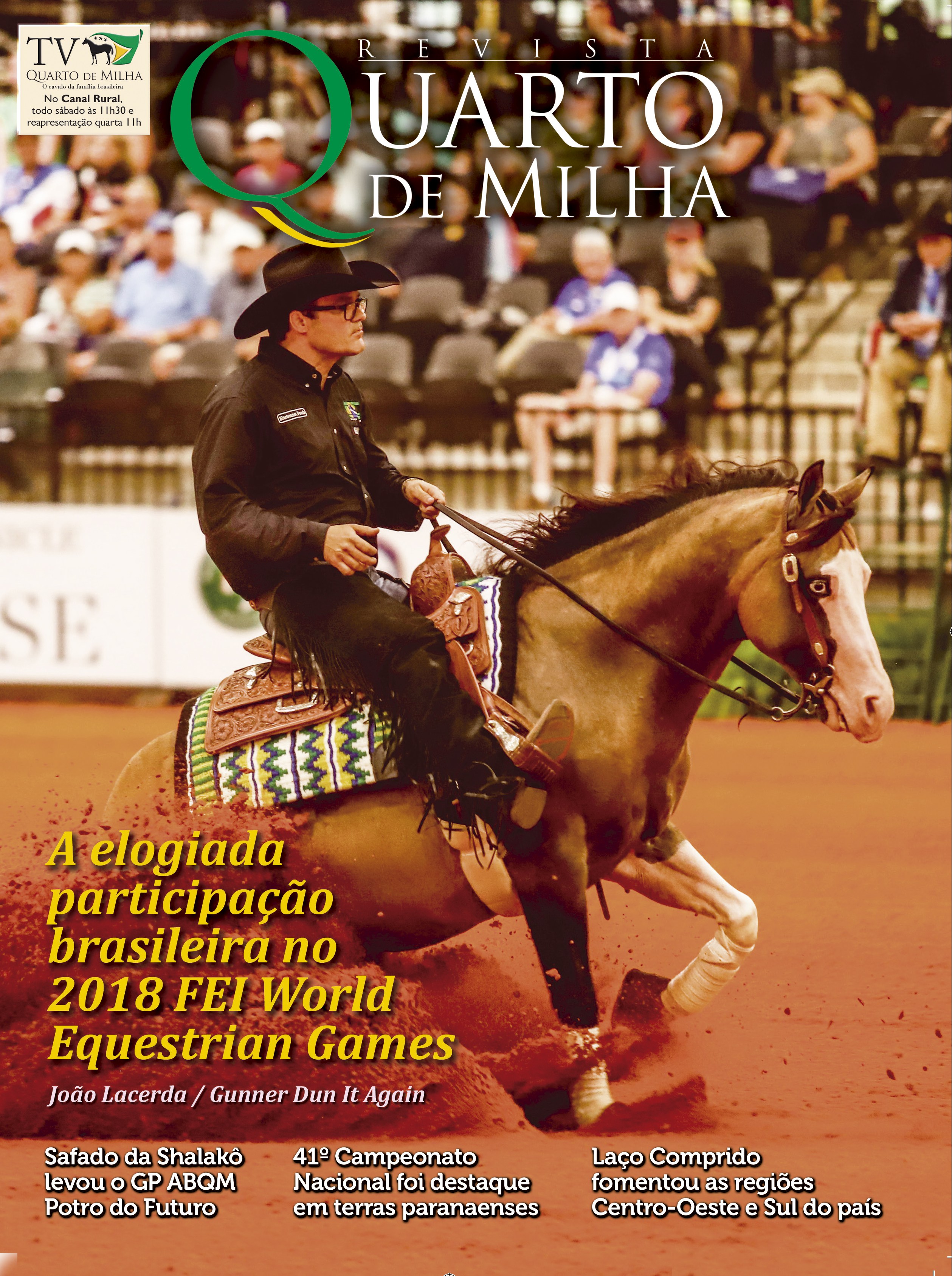 Veja com detalhes a cobertura completa do maior evento da raça, o Campeonato Nacional, o fomento aquilatado do Laço Comprido em diversas regiões do país, os campeões dos Grandes Prêmios de velocidade, a venda do campeão de Vaquejada que se tornou o recordista de preços da raça, a destacada participação dos conjuntos brasileiros nos Jogos Equestres Mundiais, além de artigos técnicos, entrevistas e outros importantes assuntos.